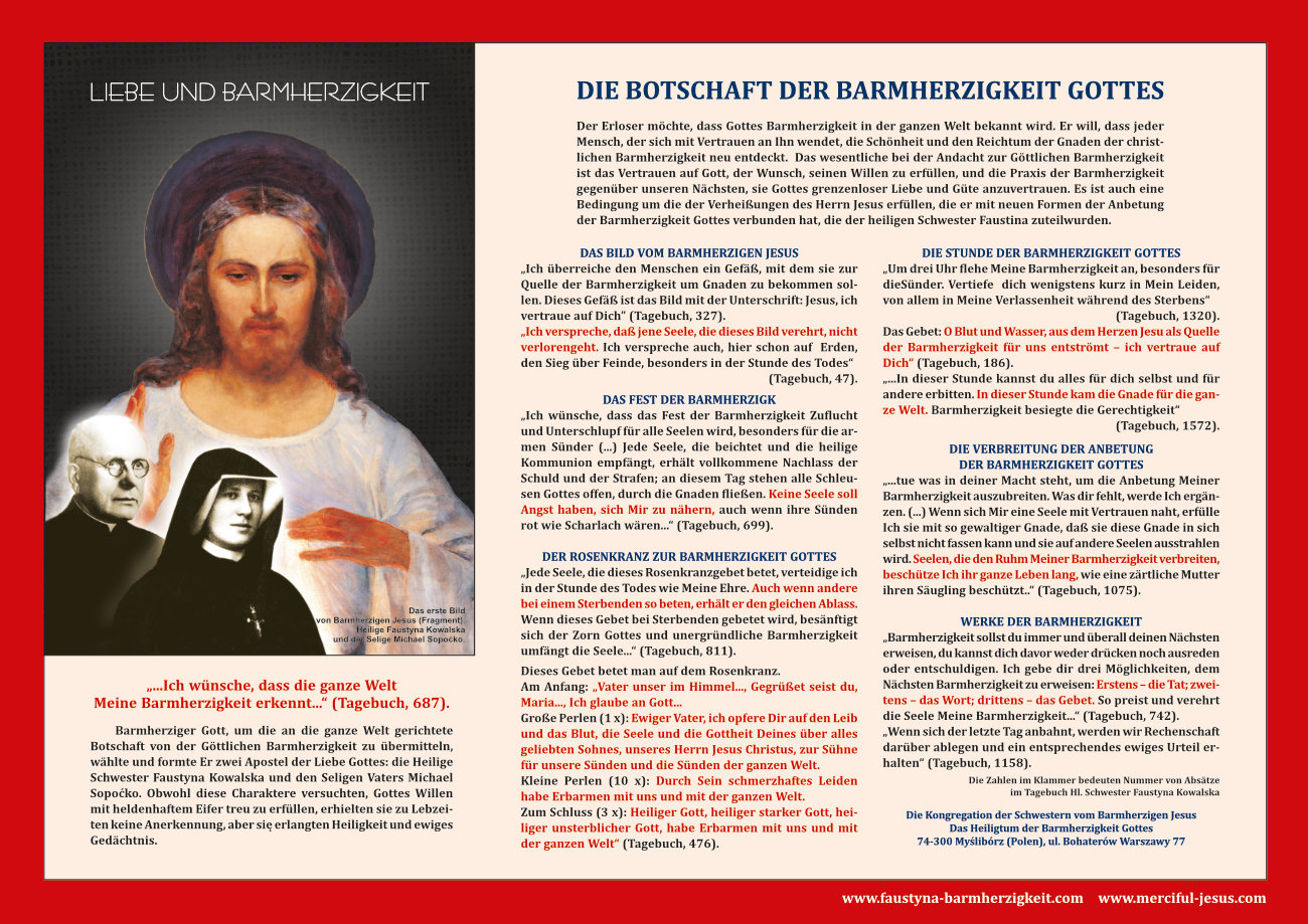 der Barmherzigkeit Gottes werden von der Kongregation der Schwestern vom Barmherzigen Jesus in 35 Ordenshäusern in Polen und im Ausland umgesetzt, darunter in drei Missionsaußenposten: in Bolivien, Sierra Leone und Südafrika. Auch durch gläubige Laienanbeter der Barmherzigkeit Gottes wird diese Botschaft in Online-Veröffentlichungen, Büchern, Reproduktionen des Bildes des Barmherzigen Jesus, Postern und Broschüren in verschiedenen Sprachen verbreitet – unter anderem für Evangelisierungszwecke in Gefängnissen, Schulen und Wallfahrtsorten.